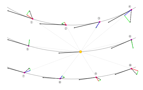 I dette matematiske afsnit betegner himmellegemets relative positionsvektor i forhold til iagttageren. Rumhastigheden er den tidsafledede heraf: