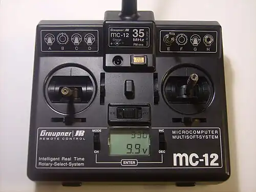 Et eksempel på et radiofjernstyringssystems fjernstyringssender. Radioantennen kan ikke ses men er i skruet ned i plaststubben foroven. De 2 "joysticks" kan styre op til 4 separate servomekanismer proportionalt.