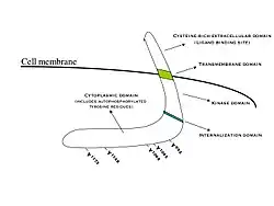 Ved binding af ligand til receptoren på cellens yderside sker der en konformationsændring af receptoren, der medfører eller stabiliserer receptoren i den dimere form. I den cytoplasmatiske del af den dimere form vil der da ske trans-fosforylering, og den således aktiverede receptor har fået bindingssteder for proteiner med SH2- og PTB-domæner (dvs. Src homologi 2-domæne og fosfotyrosin-domæne) bl.a. proteinerne Src og fosfolipase Cγ. Fosforylering og aktivering af disse to proteiner kan starte disse reaktionsveje i signalinduktionen (jf. figuren):