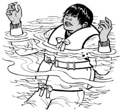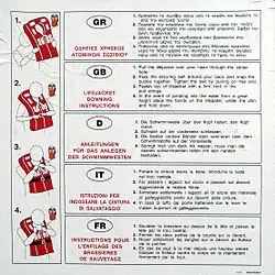 Selvoppustende redningsvest med gaspatron i brug på et amerikansk hangarskib. Elektronikken (Man Over Board Indication', MOBI -system) i vesten sender et radiosignal til skibet, når den udløses.