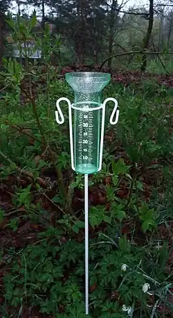 En manuel måler består af en tragtformet åbning med kendt tværsnit, som leder nedbøren ned i en beholder, som er markeret med 'mm nedbør'.