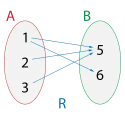 En relation er i matematisk forstand en sammenknytning mellem elementer fra to eller flere forskellige mængder. Illustrationen til højre viser et eksempel på en relation R mellem to mængder, A og B: Relationen knytter bestemte elementer fra A sammen med elementer fra B, hvilket er vist som pile mellem de relevante elementer. Som et "hverdagseksempel" på en relation kan man tænke sig, at mængden A på illustrationen repræsenterer en husstand, med medlemmerne "1", "2" og "3", mens elementerne i mængden B er husstandens telefoner: "5" er husets fælles fastnet-telefon; på dette nummer kan man (som regel) komme i kontakt med alle tre medlemmer i husstanden, så derfor er der pile hertil fra alle tre medlemmer af husstanden. "6" er en mobiltelefon, der kun bruges af ét af husstandens medlemmer; derfor er der kun én pil der fører til telefon "6".