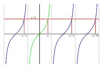 Figuren illustrerer (dele af) grafen for den matematiske funktion tangens. Den del af grafen, som går gennem origo, er vist med grøn farve. Definitionsmængden for tangens er