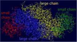 Hos planter, alger, cyanobakterier samt fototropiske og kemoautotropiske proteobakterier består enzymet almindeligvis af to typer af protein-underenheder, som kaldes den lange kæde (L med ca. 55.000 Da) og den korte kæde (S med ca. 13.000 Da)[3]. De enzymaktive substrat (ribulose-1,5-bisfosfat)-bindingssteder findes i de lange kæder, der danner dimere forbindelser, som vist på figur 1 (ovenfor til højre), hvor aminosyrer fra hver af de lange kæder bidrager til bindingsstederne. En helhed af otte lange kæde-dimerer og otte korte kæder samles til et større kompleks med ca. 540.000 Da[4]. Hos nogle proteobakterier og dinoflagellater har man fundet enzymer, der udelukkende består af lange kæder[5].