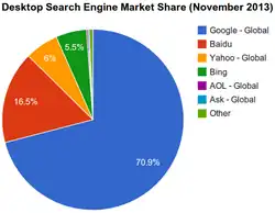 Den suverænt mest brugte websøgemaskine pr. 2024 på verdensplan på tværs af platforme er Google med en markedsandel omkring 90%. Dernæst følger Bing, Yandex, Yahoo!, og Baidu med mellem 1 og 4%.[1] Alle siderne har indekseret flere milliarder sider, men der er stadig mange sider de ikke kender.