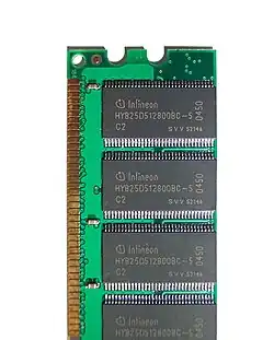 - I dynamisk RAM eller DRAM, "huskes" hver bit af en kondensator, som lades op eller "tømmes" for elektrisk ladning alt efter om pågældende bit skal være "0" eller "1". Fordelen ved denne type RAM er, at der kræves færre komponenter (blot én enkelt kondensator) pr. bit "lagerplads" end i statisk RAM, men da kondensatorerne har en ganske lille kapacitet og i praksis ikke kan gøres helt tabsfri, vil de opladede kondensatorer "glemme" deres indhold i løbet af ganske få millisekunder. Derfor kræver dynamisk RAM et såkaldt refreshing-kredsløb, som med ganske korte intervaller læser hver eneste bit, og sørger for at "genfylde" de ladede kondensatorer.