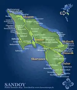 Den største bosættelse på øen er bygden Sandur. Øens totale indbyggertal er 1.274 (2023). Med til regionen hører også øerne Skúvoy og Stóra Dímun med tilsammen 48 indbyggere (2020), der udgør Skúvoyar kommuna.
