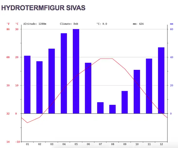 - ↑ Klima Sivas: Temperaturer, Hydrotermfigur, Klima borde til Sivas - Climate-Data.org
