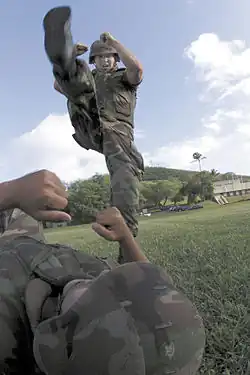 - Bronco kick – Et særligt kraftfuldt hoppende hælspark, hvor angriberen hopper op og lander med begge hæle mod målet for maksimal skade.