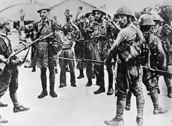 ![]() Generalløjtnant Arthur Percival, ledet af en japansk officer, gå under et hvidt flag for at forhandle om kapitulation af de allierede styrker i Singapore, den 15. februar 1942. Det var den største overgivelse af britisk-ledede styrker i historien. |