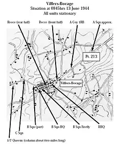 Da Villers-Bocage var på britiske hænder kørte en eskadron videre så hurtigt som muligt, uden den beordrede forudgående rekognoscering, for at besætte punkt 213.[69][71][72] Da de nåede frem angreb og ødelagde de en Kübelwagen, som kørte ad vejen imod dem. De forreste kampvogne placerede sig på markerne ved siden af vejen så kun tårnene var synlige, mens resten af eskadronen parkerede langs vejen.[73] Udenfor Villers-Bocage på vejen mod punkt 213 rykkede køretøjerne fra 4CLY's rekognosceringsenhed, regimentets hovedkvarter og A-kompagniet fra 1. riffelbrigade til side, så andre køretøjer let kunne passere og begyndte at forlade køretøjerne.[28][74][75] I sin historie om riffelbrigaden skriver major Hastings, at A-kompagniet blev beordret ud i siden af vejen for at holde den åben af officerer fra 4CLY og at terrænet var meget indesluttet, så man kunne se mindre end to hundrede meter ud til siden, så de havde allerede placeret vagtposter.[76] Historikeren D'Este er mere kritisk overfor A-kompagniets adfærd på dette tidspunkt, og henviser til at de undlod at følge doktrinen om at danne et forsvar mod alle sider, når de holdt stille.[72]