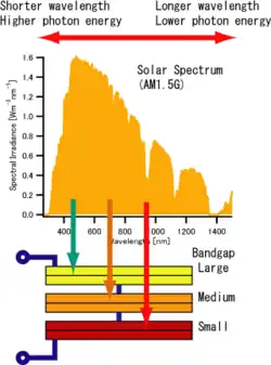 En anden måde at øge virkningsgraden af solceller på er at lægge flere forskellige solceller, der hver især er optimeret til hvert deres bølgelængdeinterval, ovenpå hinanden og lade den øverste omsætte f.eks. det blålige og grønlige lys effektivt – og det næste solcelle omsætte det gullige og rødlige lys osv.