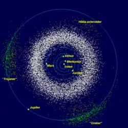 - Ceres (2,77 au) er det største himmellegeme i asteroidebæltet. Den har en diameter på lige under 1000 km, hvilket anses som tilstrækkelig stor til at dens egen gravitation kan give den kugleform, hvilket gør den til en dværgplanet. Massen af Ceres udgør omtrent en tredjedel af den samlede masse i asteroidebæltet. Da Ceres blev opdaget i 1800-tallet betragtedes den først som en almindelig planet. Den blev omklassificeret til asteroide i 1850 da flere nye asteroider blev opdaget.[45] I 2006 blev den klassificeret som dværgplanet.