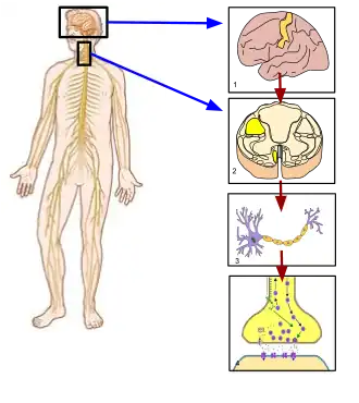 ![]() 1. (Hjerne) Præcentrale gyrus: oprindelsen af de nervesignaler der starter en bevægelse. 2. (Tværsnit af rygsøjlen) Corticospinale trakt: Mediator af beskeden fra hjernen til skeletalmusklerne. 3. Axon: budbringercellen, der bærer kommandoen om at kontrahere muskler. 4. Motoriske endeplade: Budbringer axon-cellen fortæller musklen af den skal trække sig sammen i dette punkt. | |