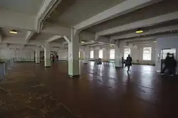 Hvert spisebord havde bænke med plads til seks mænd, selv om mindre borde og stole med plads til fire senere erstattede disse.[8] Alle indsatte samt vagter og embedsmænd spiste sammen; spisesalen havde således siddepladser til mere end 250 mennesker.[8][9] Maden, der serveres på Alcatraz, var efter sigende den bedste i USA's fængselssystem.[6] På anden sal var der et auditorium, hvor der blev vist film vist for de indsatte i weekenden.