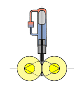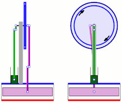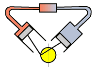 De 2 træk- og skub-stænger fra de 2 stempler sidder på samme sted på et svinghjul, som roterer højre om under normal drift.