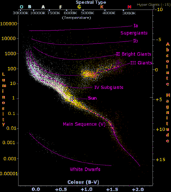 Et eksempel på et Hertzsprung-Russell diagram for en mængde af stjerner der omfatter Solen (i midten af billedet). (See "Klassifikation" herunder.)
