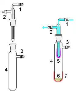 1 Kølevand ind 2 Kølevand ud 3 Vacuum/gas line 4 Sublimationskammer 5 Sublimeret stof 6 Startmateriale 7 Opvarmning