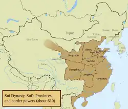 Sui-dynastiet (隋朝) genoprettede kejserdømmet Kina efter en meget lang periode med indre stridigheder. Dynastiet regerede riget fra 581 til 618 og blev grundlagt af Kejser Wen, født Yang Jian i år 541. Kejser Wen regerede fra år 581 til år 604.