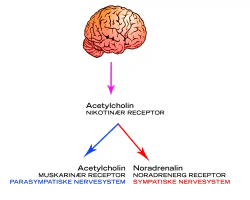 Den første synapse i den sympatiske kæde medieres af nikotinære receptorer, som aktiveres af acetylcholin, hvor målsynapsen er medieret af adrenerge receptorer, som fysiologisk aktiveres af noradrenalin og adrenalin. En undtagelse er svedkirtler, som modtager sympatisk aktivering, men har muskarinære receptorer, som normalt er karakteristiske for det parasympatiske nervesystem. En anden undtagelse er visse dybe muskelblodkar, som har acetylcholinreceptorer, og som udvides (i stedet for sammentrækkes) når den sympatiske aktivitet øges.