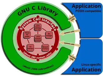 I den mest grundlæggende form angiver programmet et nummer på et systemkald og en reference til eventuelle inputdata. Kernen slår systemkaldet op i en tabel, for at finde den adresse, der skal udføres programkode fra. Når systemkaldet er overstået, kopieres eventuelt output tilbage til det kaldende program. Normalt vil systemkald blive brugt via et programbibliotek, som vil klare selve opsætningen, så systemkaldene ligner almindelige funktionskald. Under UNIX hedder dette programbibliotek libc. Et kald til styresystemet via et sådant programbibliotek foregår i følgende trin: