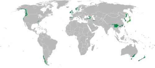Vestvendte kystegne, alle nær Atlanterhavet i Irland, Bretagne, det sydlige Norge[1] og nordlige Spanien. Skovene i disse egne består hovedsageligt af forskellige sorter af eg, typisk vintereg (Quercus petraea) og er blevet udnyttet og påvirket af mennesker i århundreder. Visse skovområder i England betegnes indimellem også som tempererede regnskove.