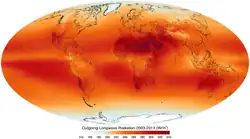 Strålingskølingen fra udgående langbølget stråling er den primære måde som jorden mister energi på. Balancen mellem dette energitab og energien, som kommer fra strålingsvarmen fra indkommende kortbølget solstråling, afgør den globale opvarmning eller nedkøling af jorden (jordens strålingsbalance).[2] Lokale forskelle mellem strålingsopvarmningen og - kølingen giver energien, som driver atmosfærens bevægelser.