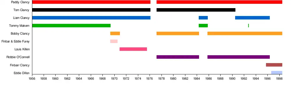 | Tidligere medlemmer | Liam Clancy Paddy Clancy Tom Clancy (deceased) Tommy Makem (deceased) Bobby Clancy Louis Killen Robbie O'Connell Finbarr Clancy Eddie Dillon |