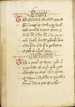 - ↑ "Thys fourme of cury ys compyled of þe mayster cokes of kyng Richard þe secund ... by assent of Maysters of physik and of phylosophye".--"Things sweet to taste: selections from the Forme of Cury". 1996 ISBN 0-86373-134-1