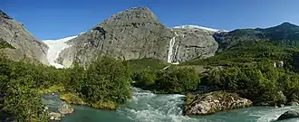 ![]() Tjøtafossen i baggrunden, midt i billedet ved siden af, og under Briksdalsbreen. | |