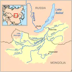 | Kort over Selenge-bækkenet Tjikoj (Chikoi) i midten til højre. | |