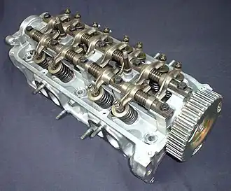 (2) Den overliggende knastaksel bliver drevet af det store tandhjul og knastakslen er ikke særlig synlig, men ventilvippearmene hviler alle på knastakslen i midten nede mellem de to vippearmsaksler.