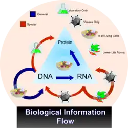 Molekylærbiologiens centrale dogme (egentlig en videnskabelig hypotese) blev formuleret i 1958 af Francis Crick, der havde været med til at opdage DNA's struktur 5 år tidligere. Dogmet fastslår at information i naturen kun kan flyde fra nukleinsyrer til nukleinsyrer og fra nukleinsyre til protein; information kan ikke flyde fra protein til protein, eller fra protein til nukleinsyre. I de tidlige fortolkninger af dogmet kunne information heller ikke flyde fra DNA til protein, fra RNA til RNA eller fra RNA til DNA; senere opdagelser har dog vist nogle specielle undtagelser fra disse tilfælde, eksempelvis revers transskription (fra RNA til DNA). Transskription udgør sammen med replikation og translation de tre klassiske informationsstrømme kendt fra det centrale dogme.