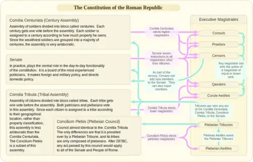 Diagram, der viser "checks and balances" (magtadskillelse) i den romerske republiks forfatning