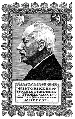 ![]() Troels Lund portrætteret af Hans Tegner i 4. udgave af "Dagligt Liv i Norden" | |