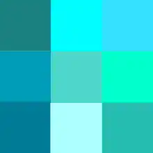 Farven er en af de tre primærfarver i CMYK-farvesystemet. Den minder meget om turkisblå, men er ikke helt den samme farve.