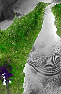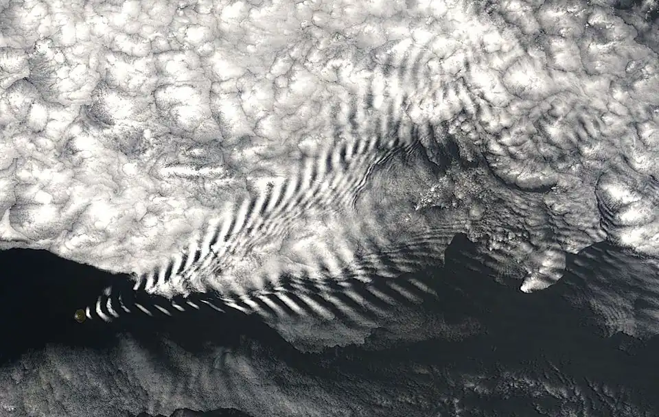 Planeten Venus roterer meget langsomt, men de øverste skyer bevæger sig med en fart på omkring 100 m/s (’superrotation’). I synligt lys kan man ikke se planetens overflade, fordi den globalt er dækket af et tykt skylag bestående af dråber af svovlsyre. Skylaget har en tykkelse på op til 20 km og dets overside befinder sig i en højde af 65 km over overfladen. I 2015 opdagede man på fotografier optaget af den japanske rumsonde Akatsuki i kredsløb om Venus nogle skyformationer, som i kontrast hertil i flere døgn holdt sig næsten fast over et underliggende højland på planetens overflade.[2][3] Fænomenet fortolkes som en tyngdebølge opstået ved passagen af dybereliggende skyer hen over det bjergrige område ’Aphrodite Terra’.[4] Fortolkningen støttes af numeriske beregninger. Et problem for udlægningen er dog, at det normalt antages, at der er nærmest vindstille helt nede ved overfladen, men dette er måske alligevel ikke tilfældet.