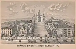 En tidlig illustration af campus fra 1885-udgaven af Wisconsin Blue Book.