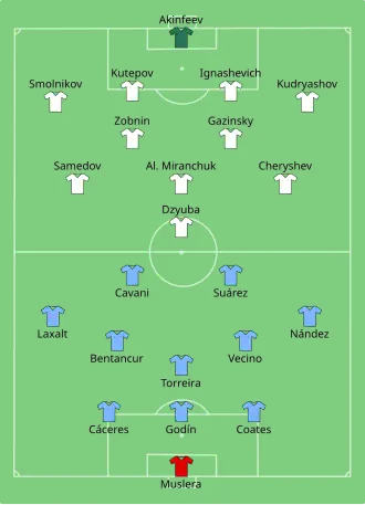 - 1 2 3 "Tactical Line-up – Group A – Uruguay v Russia" (PDF). FIFA.com. Fédération Internationale de Football Association. 25. juni 2018. Arkiveret fra originalen (PDF) 15. september 2018. Hentet 25. juni 2018.