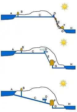 Energien bliver produceret, ved at vandet strømmer gennem en turbine. Til turbinen er der fæstnet en aksel, som går til en elektrisk generator. Det er generatoren, som producerer strømmen. Vandet løber gennem en afløbstunnel og ud i floden eller søen igen.