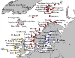 - Typisk udstyr på en manuel vejrstation (Ny-Ålesund): Nedbørmåler til venstre og termometerhytte til højre.