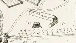 ![]() Vester Ladegård 1677 bag reberbane og Hasseris Å (uddrag fra Resens Atlas) | |