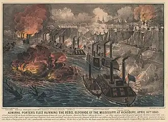 Den 16. april, en klar, men måneløs nat, sendte Porter syv kanonbåde og tre tomme troppetransportskibe ladet med forsyninger af sted for at passere kanonerne ved Vicksburg. De var omhyggelige med at lave mindst mulig støj og undgå lys, men forberedelserne var ikke effektive. De konfødererede vagter opdagede skibene, og skrænterne eksploderede i kraftig artilleriild. Der blev tændt bål ved bredderne for at forbedre sigtbarheden. Unionens kanonbåde skød tilbage. Porter bemærkede, at de konfødererede fortrinsvis ramte skibenes øverste dele, og sluttede heraf, at de ikke kunne sænke kanonerne længere, så han lod sine skibe følge den østlige bred, lige under kanonerne. Skibene var så tæt på land, at han kunne høre de konfødererede ledere der udstedte kommandoer, og granaterne der fløj hen over hovederne på mandskabet. Flåden overlevede med beskedne skader – 13 blev såret, og ingen dræbt. Skibet Henry Clay blev ødelagt og brændte ved vandkanten. Den 22. april blev yderligere seks skibe lastet med forsyninger sendt af sted. Et af skibene gik tabt, men ingen blev dræbt – besætningen flød ned ad strømmen på resterne af skibet.