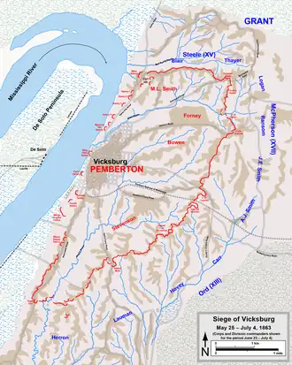 - Unionshæren nærmede sig Vicksburg og indesluttede Pembertons styrke. Grant forsøgte to angreb for at bryde gennem de stærke konfødererede skanser: den 19. og den 22. maj. Det sidste angreb havde nogen fremgang i starten i McClernands sektor, men blev slået tilbage med et tab på 3.200 mand. Johnston gav Pemberton ordre til at evakuere byen og redde sin hær, men Pemberton mente at det var umuligt at trække sig sikkert tilbage. Johnston planlagde at angribe Grant og undsætte Pemberton, men kunne ikke arrangere det i tide. Grant belejrede den konfødererede armé. Den 4. juli, efter seks uger hvor soldater og civile i Vicksburg var uden forsyninger og konstant udsat for artilleribeskydning, overgav Pemberton byen og sin hær.[17]