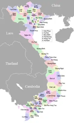 Vietnam er inddelt i 58 provinser (tỉnh, ental og flertal) og 5 kommuner* (thành phố trực thuộc trung ương, ental og flertal):