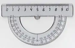En 400g vinkelmåler med markeringer i nygrader.- En "Cras Navigation Plotter" dobbel-vinkelmåler; i forgrunden.