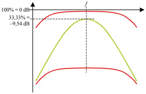 Til højre ses frekvenskarakteristikken i wienbro-oscillatorens filter: Vandret hen ad koordinatsystemets x-akse findes en frekvensskala, hvor filterets resonansfrekvens er markeret ved , og langs den lodrette y-akse har man dæmpningen, udtrykt i f.eks. procent eller decibel. I en wienbro-oscillator tilstræber man at og hhv. og er parvis lige store: Det giver filteret den "A-formede" frekvenskarakteristik der er vist som en grøn kurve – man bemærker at kurven "topper" med 33,33% (dvs. en tredjedel af signalet) eller knap −10 dB ved frekvensen .