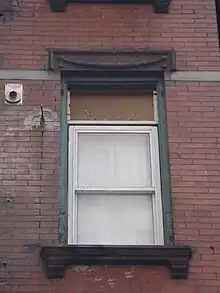 The five-story, four-bay running-bond brick tenement building at 109 Washington Street was constructed in 1885 to be a residential structure that extends nearly all the way back to its rear lot line. The original windows were most likely three-over-three double-sash windows and have what appear to be molded brownstone sills and lintels with neo-Classical inspired swags reliefs. The painted sheet-metal, neo-Grec cornice held up by projecting brackets has a matching sheet-metal belt course just below the cornice; both are painted a brown color to resemble the cast iron window trim. These architectural details were most likely purchased from builder's yards but the subtle swag detail and the use of decorative finishings on the windows, as opposed to lintels and sills with no ornamentation at all, indicates at least some desire to provide ornamentation on the façade.[32] A belt course of slate or bluestone runs through the upper edge of the windows on each floor, and a fire escape on the façade of the building has been extant on the building beginning some time prior to 1907; the current fire escape was most likely preceded by another one, due to holes in the masonry of the facade where the previous escape would have been attached. The fire escapes were typically used to air out bedding, dry laundry, or store large items such as basins or baths.[33]
