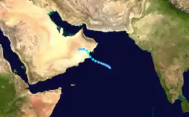 After becoming a tropical storm, the system's structure became more aligned as it developed an anticyclone aloft. Fueled by water temperatures of 29 °C (84 °F), the cyclone intensified further.[1] At 03:00 UTC on June 11, the Omani city of Fahud recorded sustained winds of 75 km/h (45 mph), and a station on Masirah Island recorded a pressure of 994 mbar (29.4 inHg). On this basis, the JTWC estimated that the storm attained peak winds of 75 km/h (45 mph).[2] However, a nearby ship reported sustained winds of 85 km/h (55 mph), and the well-defined structure on satellite imagery suggested winds as strong as 120 km/h (75 mph).[1] Moving northwestward, the cyclone made landfall around 09:00 UTC on June 11 about 130 km (80 mi) southwest of Masirah Island in southeastern Oman,[2] at a location named Ras Madrakah.[1] It quickly weakened over the desert terrain and dry air, and the circulation dissipated by June 12 over the central portion of the country.[2] However, the remnants turned to the southwest, steered by a northerly flow. It entered the Rub' al Khali, or Empty Quarter, of Saudi Arabia late on June 12, and continued slowly westward. The storm's interaction with the monsoon brought the Intertropical Convergence Zone northward into Oman and Yemen, bringing unusually heavy rainfall until the system gradually wound down.[1]