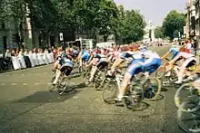 Final stage: peloton rounding a corner in Westminster